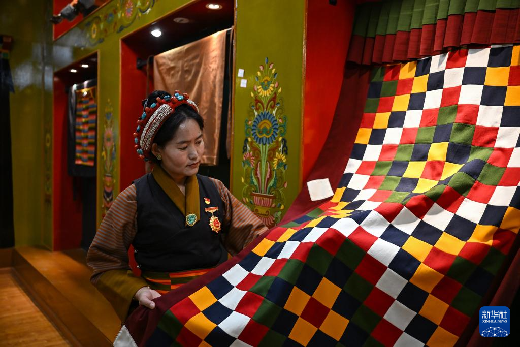 9月1日,在西藏日喀則市仁布縣特色產(chǎn)業(yè)孵化園,亞德細(xì)褐紡織手工藝傳承人南木珍查看展示的紡織品成品。新華社記者 孫瑞博 攝 ??