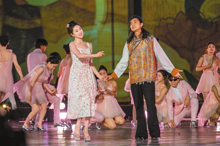 湖南民謠樂隊與山南搖滾樂隊帶來全新創(chuàng)作歌曲《雅礱歡歌》。這首歌以湖南童謠《月亮粑粑》和山南童謠為創(chuàng)作基底,兩支青春樂隊與山南職高的15名吉他手共同奏響青春樂章,“融”出別樣精彩。開幕式晚會將《次仁拉索》和《今天你要嫁給我》進行了巧妙的“嫁接”,講述了各民族在交往交流交融中涌現(xiàn)出的愛情故事。