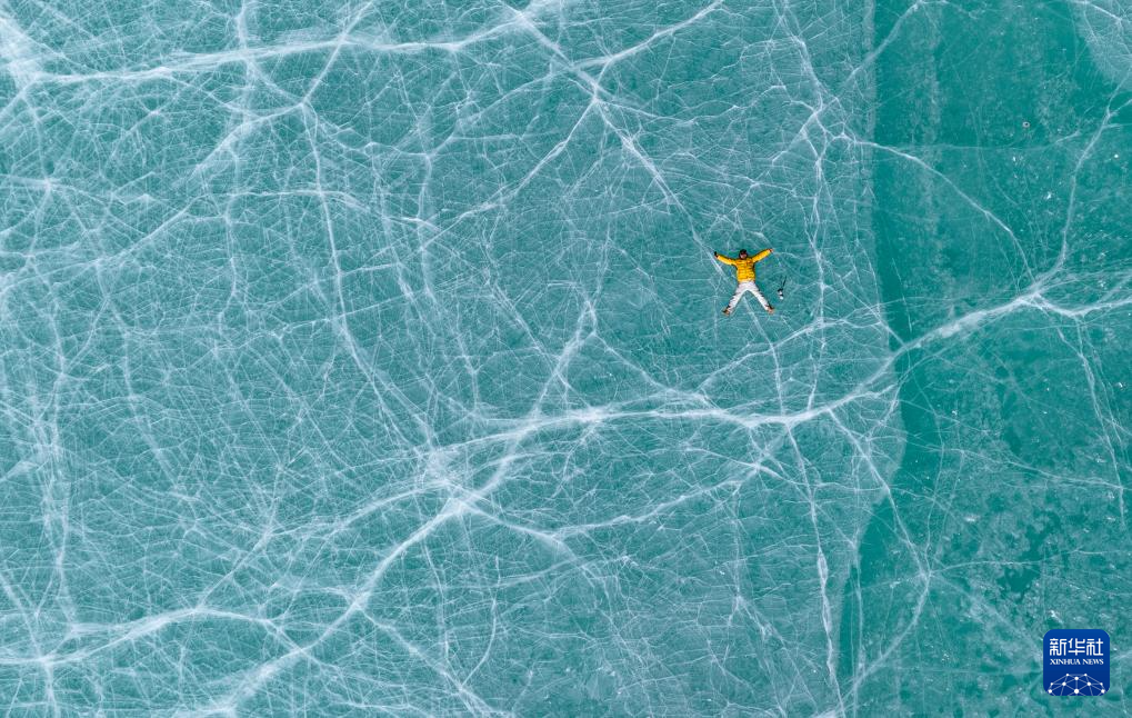 12月7日,一名游客躺在瓊穆崗嘎峰前的冰湖上拍照(無人機照片)。新華社記者 丁增尼達 攝 ??