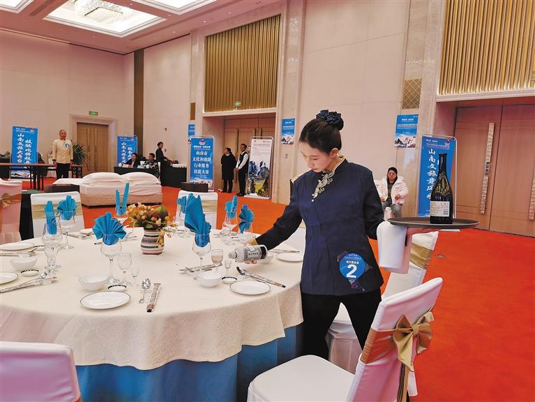 圖為餐廳服務比賽現(xiàn)場,選手正在以規(guī)范動作進行擺盤(杯)、桌花、倒酒等環(huán)節(jié)比賽。記者 孫開遠 攝