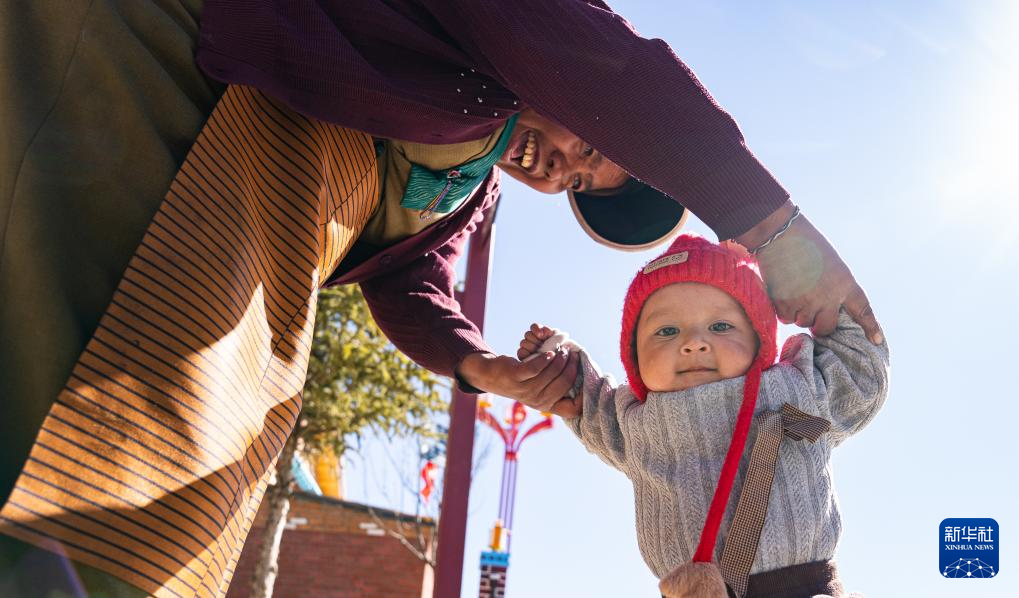 12月15日,達曼新村的一名婦女在教孩子走路。新華社記者 丁增尼達 攝 ??