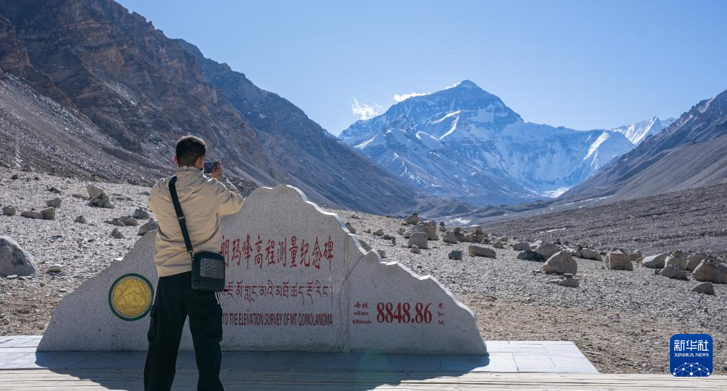 12月14日,游客在珠穆朗瑪峰高程測量紀念碑前拍照留念。新華社記者 丁增尼達 攝 ??