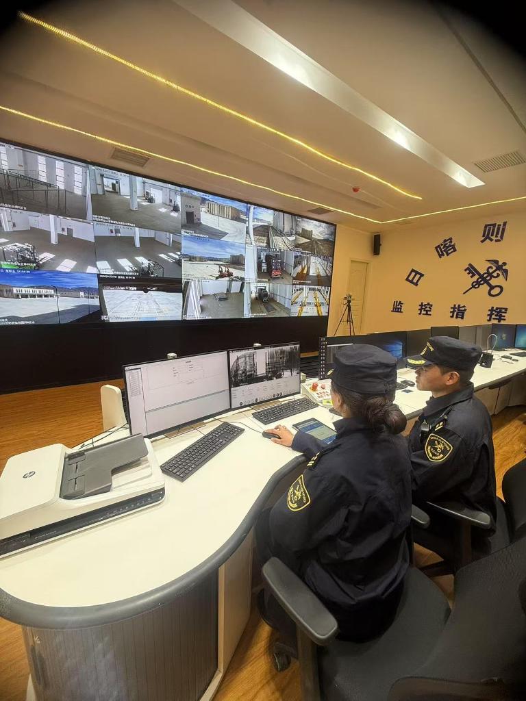 拉薩海關(guān)所屬日喀則海關(guān)關(guān)員在國(guó)際陸地港出口查驗(yàn)場(chǎng)監(jiān)控指揮中心查看H986掃描貨物情況(圖為拉薩海關(guān)提供)