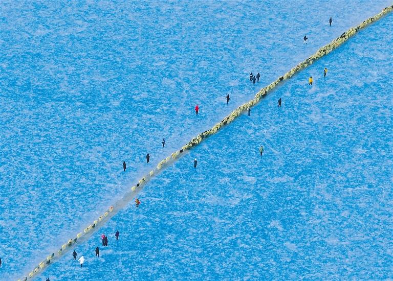 清晨,當(dāng)?shù)谝豢|陽(yáng)光灑在冰面上,牧民便開始了他們的旅程。穿著傳統(tǒng)服飾的老爺爺帶頭驅(qū)趕著羊群踏上冰面。羊群沿著爐灰鋪成的小路緩緩前行,宛如一條長(zhǎng)長(zhǎng)的金色線條,在藍(lán)冰上勾勒出一幅亮麗畫卷。途中,偶爾會(huì)有小羊因冰面濕滑而摔倒,牧民總是及時(shí)將它們扶起,或背或抱地送到島上。