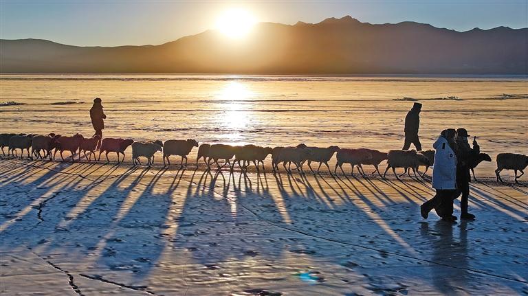 朝陽(yáng)下,羊群在牧民和民警的保護(hù)下前往湖心島牧場(chǎng)。