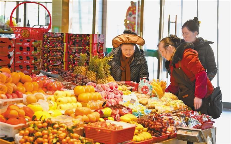 隨著藏歷新年的臨近,拉薩節(jié)日市場持續(xù)升溫,街頭巷尾擠滿了前來采購年貨的市民群眾,卡賽、酥油花、水果、肉蛋奶等商品琳瑯滿目,節(jié)日氛圍愈加濃厚。 圖為市民群眾在超市內(nèi)選購水果。記者 唐斌 攝