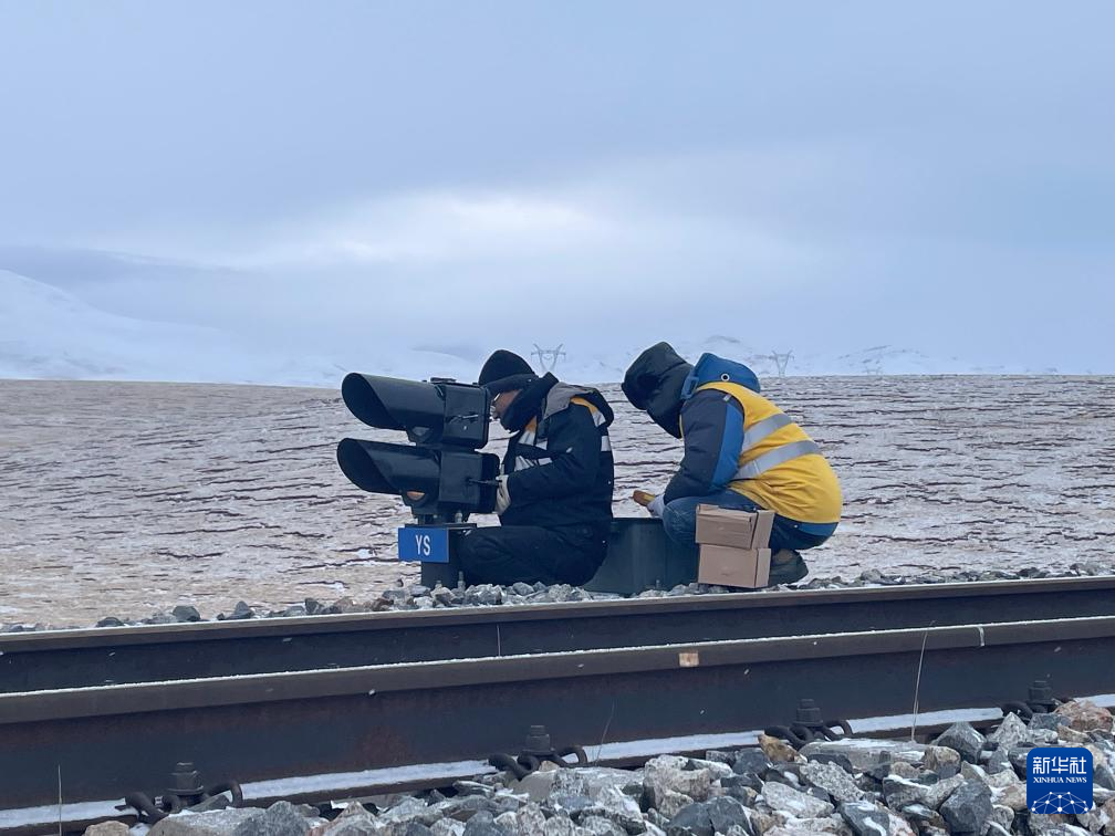 那曲信號車間安多信號工區(qū)信號工人劉舉(左一)在和隊友更換信號機燈盤。新華社發(fā)(史超攝)