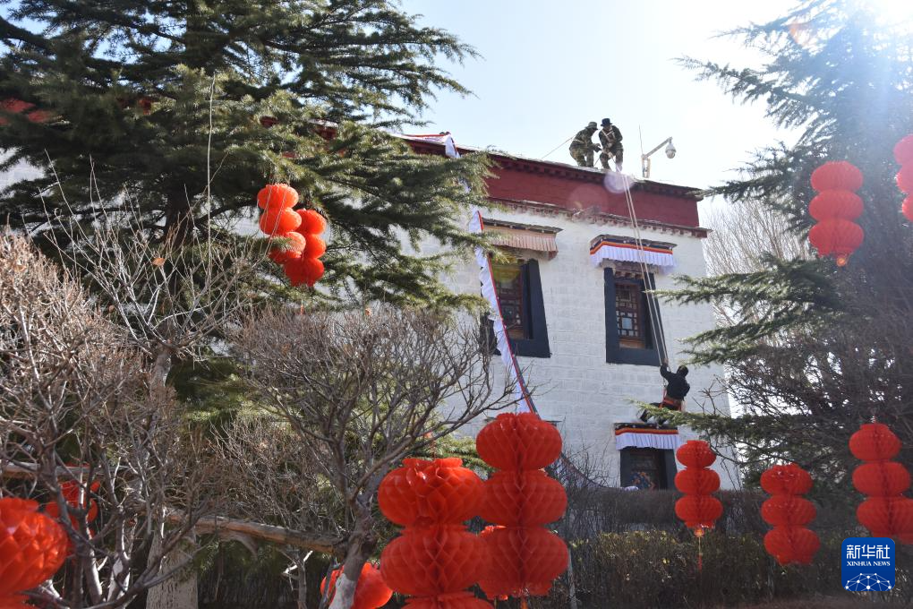 2月18日,布達拉宮管理處工作人員更換“香布”。新華社記者 春拉 攝