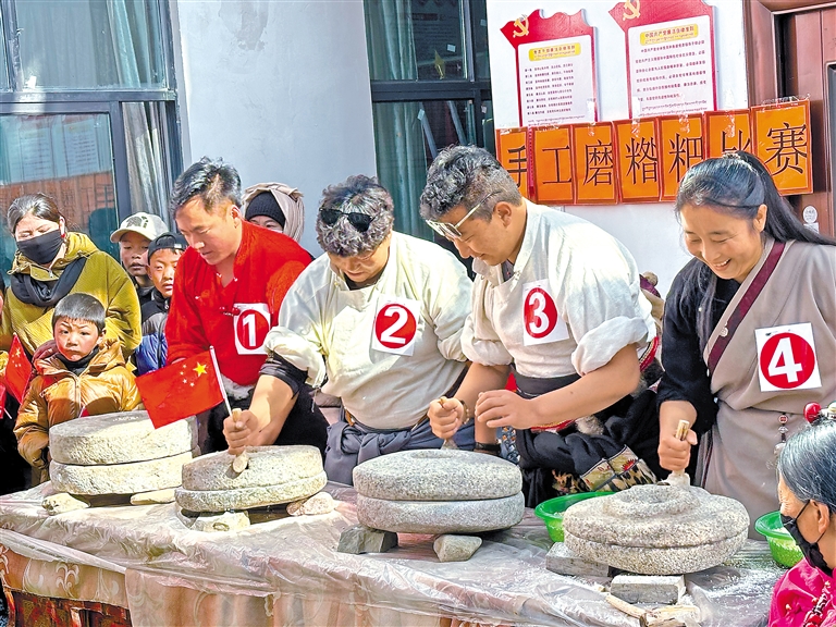 圖為比如縣“鄉(xiāng)村振興 那曲奮進(jìn)”手工磨糌粑比賽現(xiàn)場。 記者 趙書彬 萬靖 攝