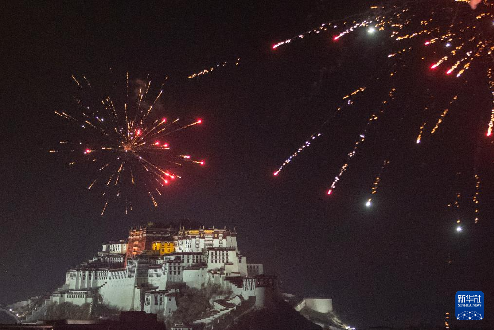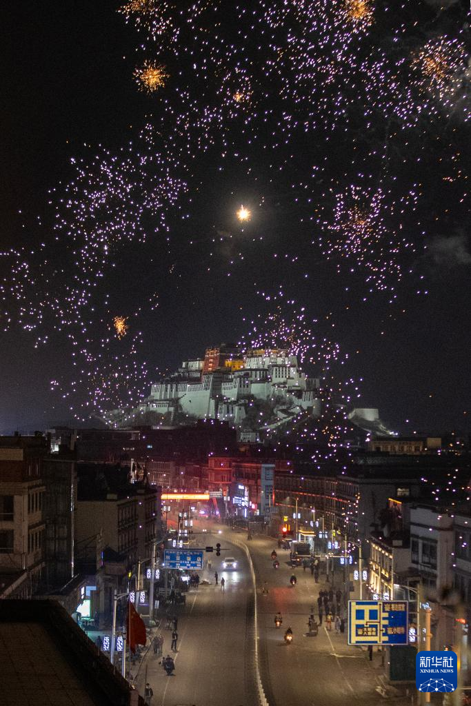 這是“古突”夜煙花映照下的布達(dá)拉宮(2月27日攝)。新華社記者 姜帆 攝
