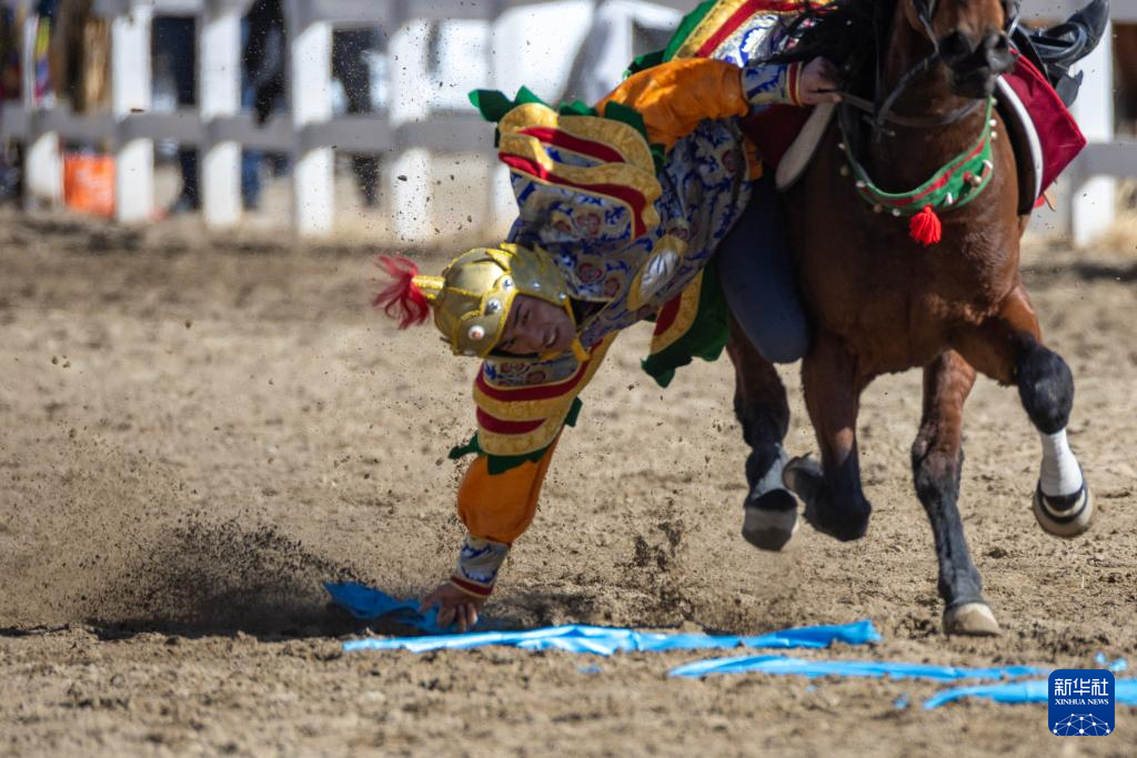 馬術(shù)隊員在表演“馬上拾哈達”項目