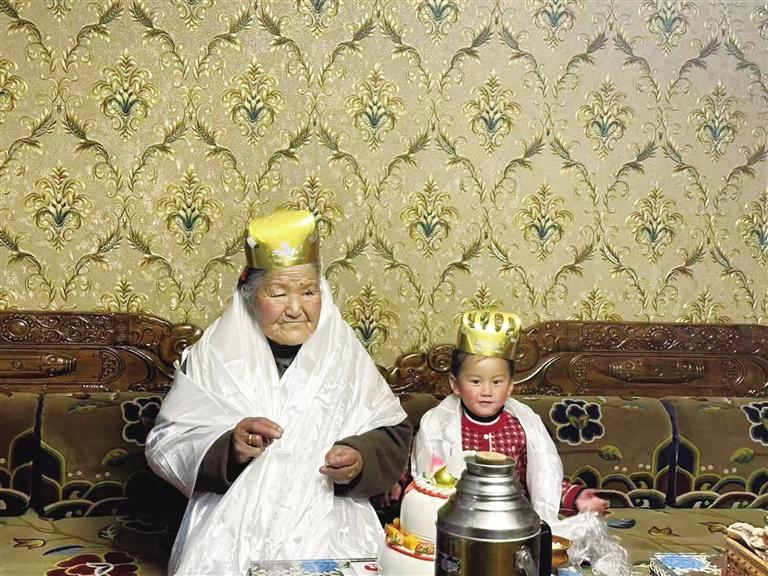 壽宴上,三歲的重孫女格桑舉著銀制酒壺向太奶奶敬酒獻(xiàn)哈達(dá),并祝福奶奶:“莫啦 ‘沖卡’扎西德勒!”看著重孫女踮腳為她敬獻(xiàn)哈達(dá),奶奶渾濁的眼里忽然滾落兩顆淚珠。