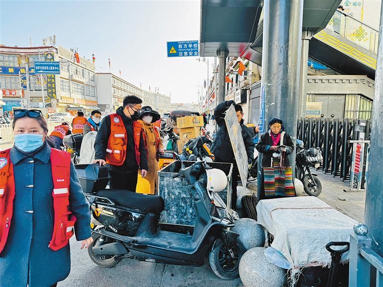 圖沖賽康社區(qū)全體工作人員及駐居工作隊,開展非機動車亂停亂放專項整治行動。 記者 央金 攝
