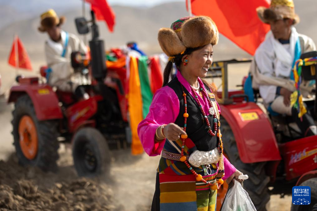 儀式現(xiàn)場,38臺(tái)農(nóng)用拖拉機(jī)整齊停放。11時(shí)許,在眾人的祈福聲中,清一色身著白色氆氌藏裝、頭戴長壽金絲帽的拖拉機(jī)手把拖拉機(jī)開進(jìn)農(nóng)田,機(jī)身后掛的銀色犁頭刨開沉睡了一整個(gè)寒冬的沃土,盛裝的婦女們緊隨拖拉機(jī),播撒希望的種子。