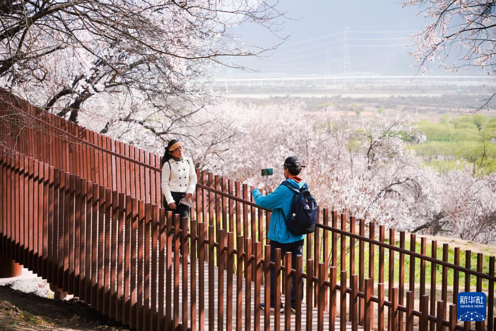 3月29日,游客在林芝市巴宜區(qū)嘎拉村賞花拍照。新華社記者 齊芷玥 攝 ??