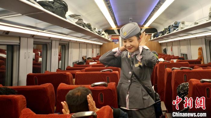 圖為譚珍帶著旅客做耳鳴操,緩解旅客在經(jīng)過隧道時(shí)的耳鳴癥狀。貢桑拉姆 攝