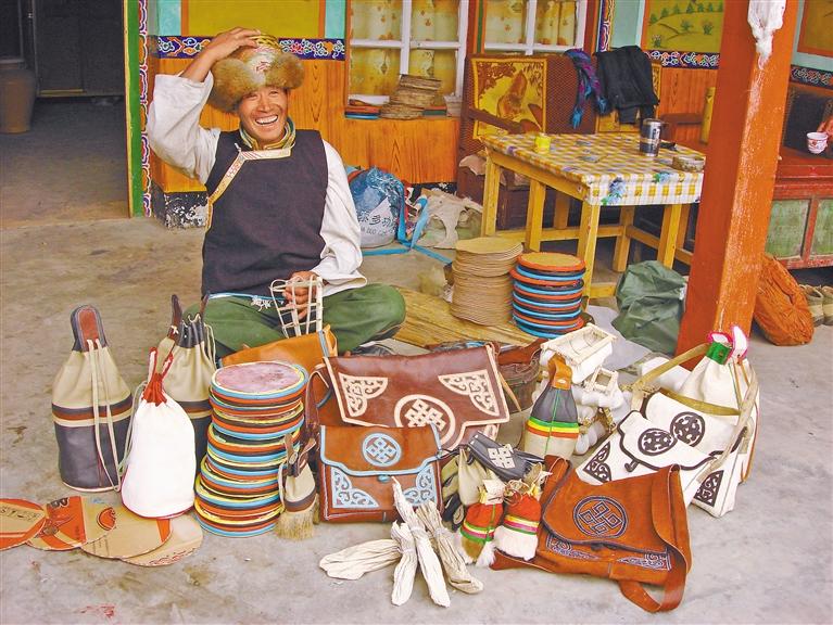 手藝人展示縣級非物質文化遺產俊巴皮雕作品 。