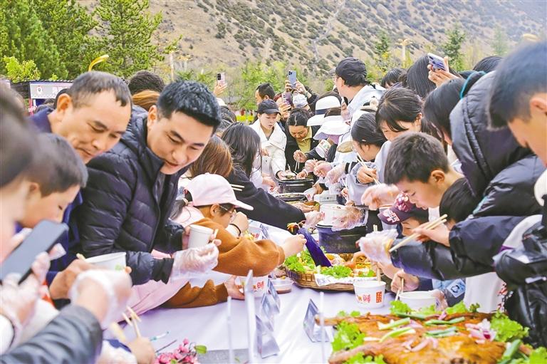 圖為在活動(dòng)現(xiàn)場(chǎng),市民和游客品嘗林芝特色菜。記者 劉楓 謝筱純 攝