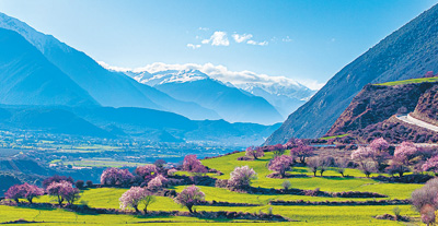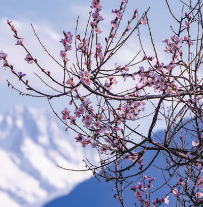 盛開(kāi)的桃花與遠(yuǎn)處的雪山相映成景。圖為記者徐馭堯攝