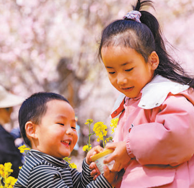 小朋友在桃樹(shù)下開(kāi)心玩耍。圖為記者徐馭堯攝