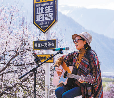 游客在桃花節(jié)現(xiàn)場(chǎng)即興彈唱。圖為記者徐馭堯攝