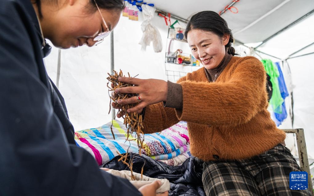 在那曲市索縣西昌鄉(xiāng),牧民將清理好的蟲草裝袋收納(5月18日攝)。新華社記者 丁增尼達(dá) 攝 ??