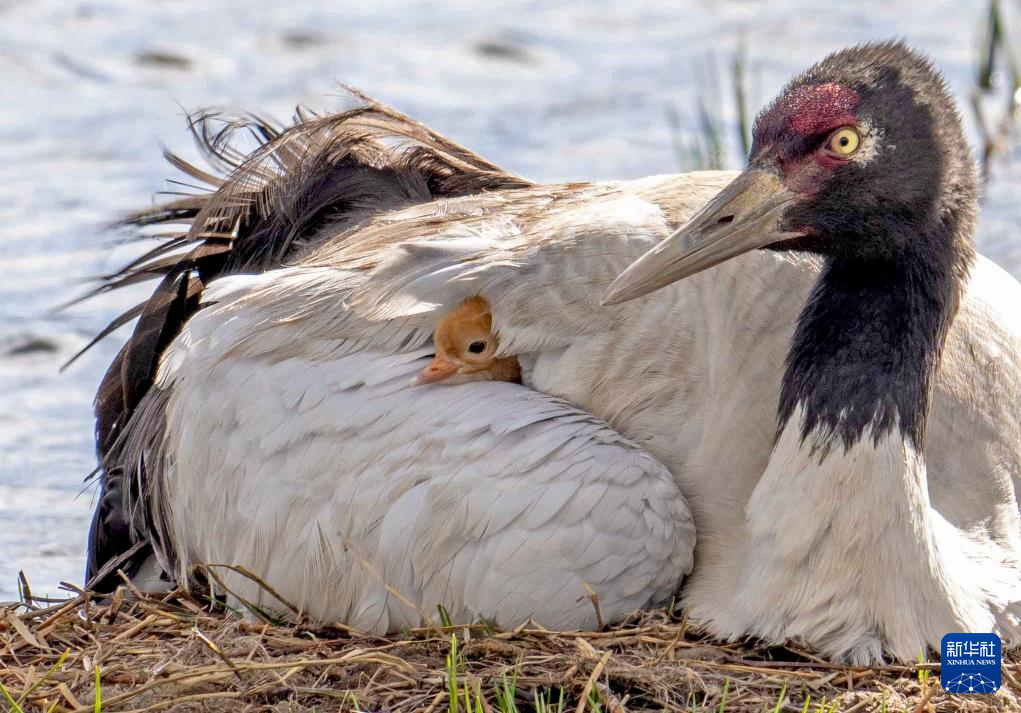 一對黑頸鶴在那曲市申扎縣的濕地上照顧剛出殼的雛鳥,一只將其護在身下保持溫暖,另一只則在旁保持警戒(6月4日攝)。新華社記者 姜帆 攝 ??