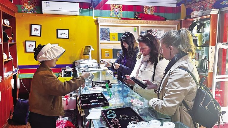 國(guó)際旅行商在文創(chuàng)店內(nèi)購買紀(jì)念品。