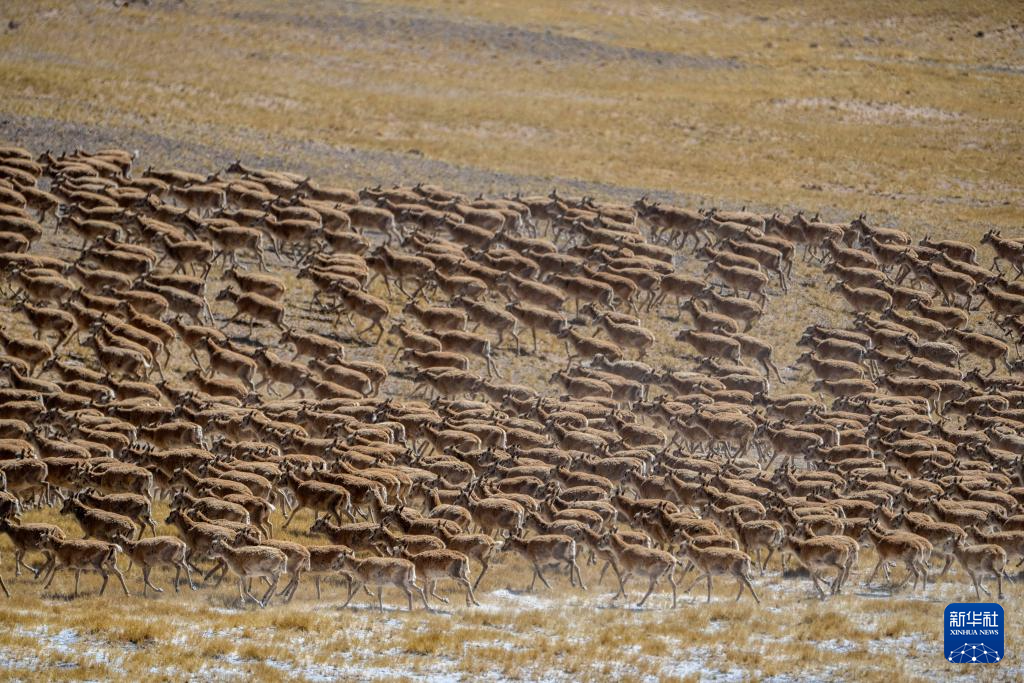在羌塘國(guó)家級(jí)自然保護(hù)區(qū)核心區(qū)拍攝的遷徙中的雌藏羚羊群(6月9日攝)。新華社記者 旦增尼瑪曲珠 攝 ??