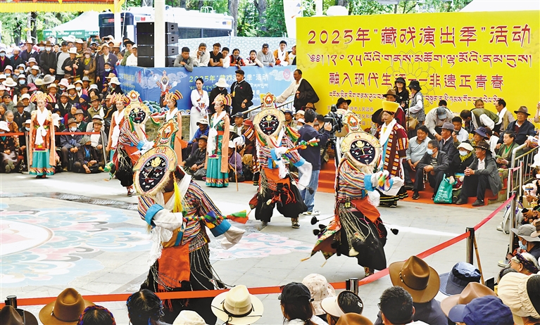 6月13日,以“融入現(xiàn)代生活——非遺正青春”為主題的2025年“藏戲演出季”活動在拉薩市宗角祿康公園舉行。本次活動由非遺體驗、產(chǎn)品展銷、藏戲展演三個部分組成,精彩的表演吸引了眾多市民游客觀看。圖為活動現(xiàn)場,拉薩市堆龍德慶區(qū)措麥藏戲隊帶來的藏戲劇目《智美更登》。記者 旦增蘭澤 攝