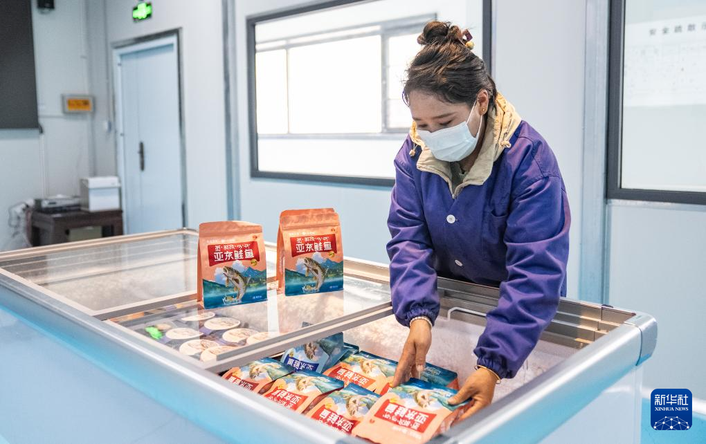工作人員在車間內(nèi)將亞東鮭魚的加工產(chǎn)品放入冷藏柜(6月19日攝)。新華社記者 丁增尼達 攝 ??