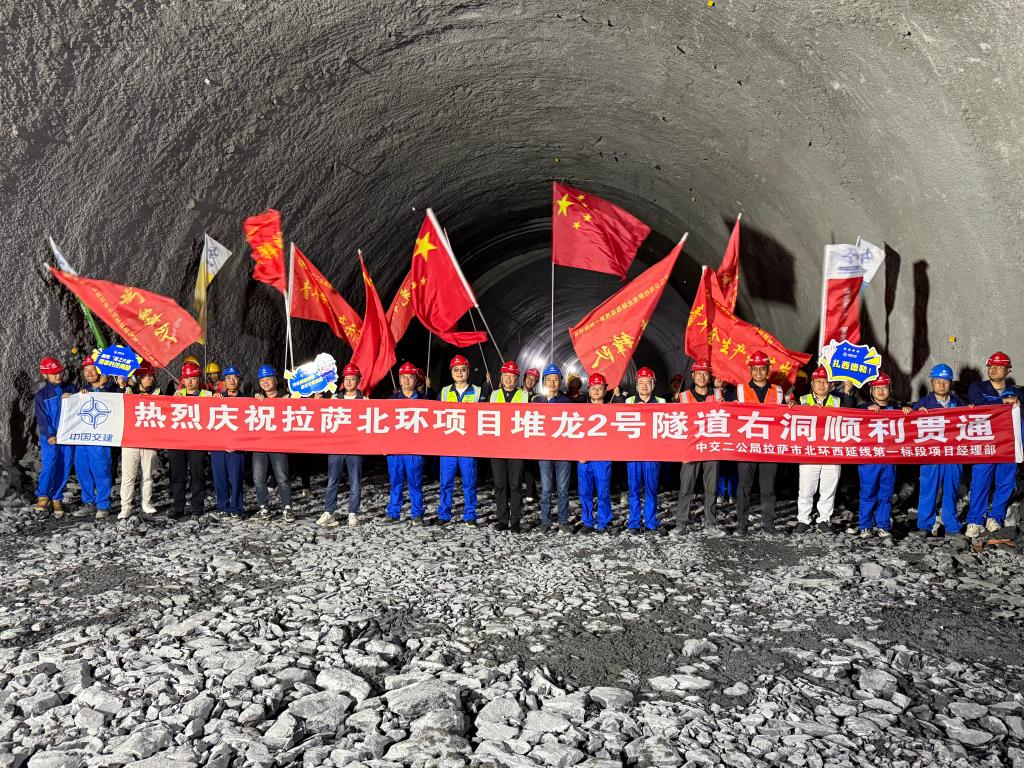 中交二公局工作人員在堆龍2號隧道貫通現(xiàn)場慶祝留影。(中交二公局供圖)
