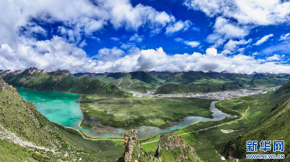 圖為7月2日拍攝的嘉乃玉錯與不遠處的嘉黎縣縣城(無人機照片)。新華網(wǎng)發(fā) 車宇軒 攝