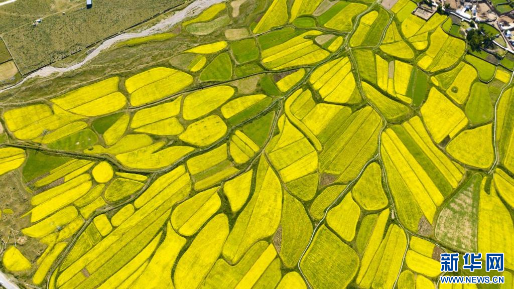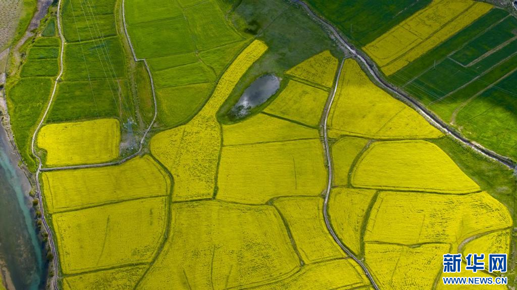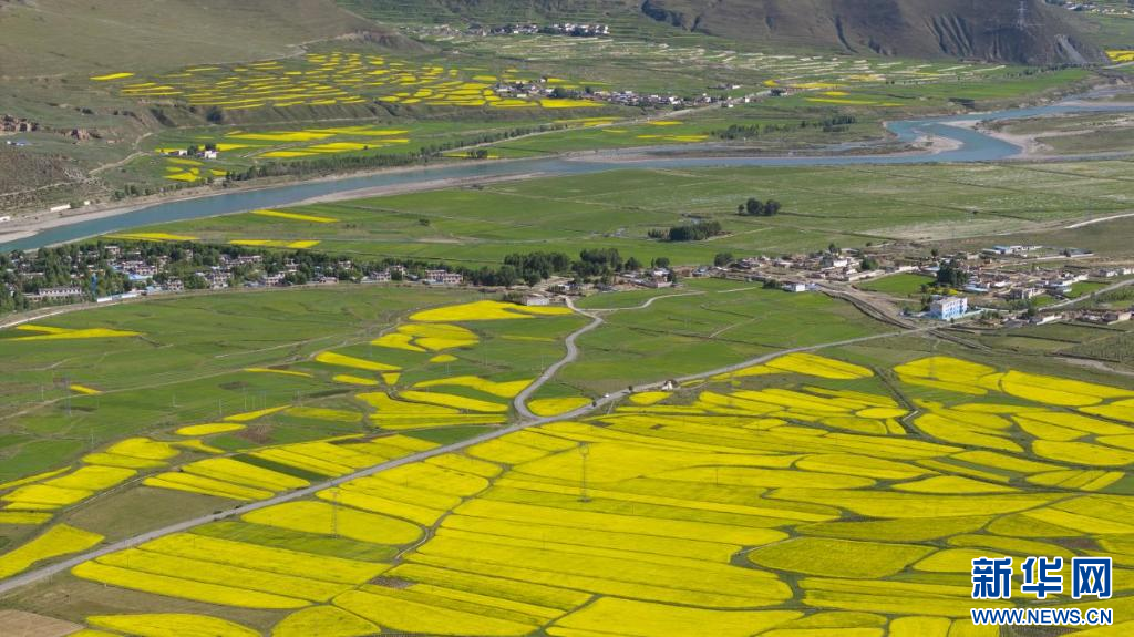 圖為7月2日拍攝的俯瞰墨竹工卡縣扎西崗鄉(xiāng)加爾多村油菜花田(無人機(jī)照片)。新華網(wǎng)發(fā) 洛克 攝