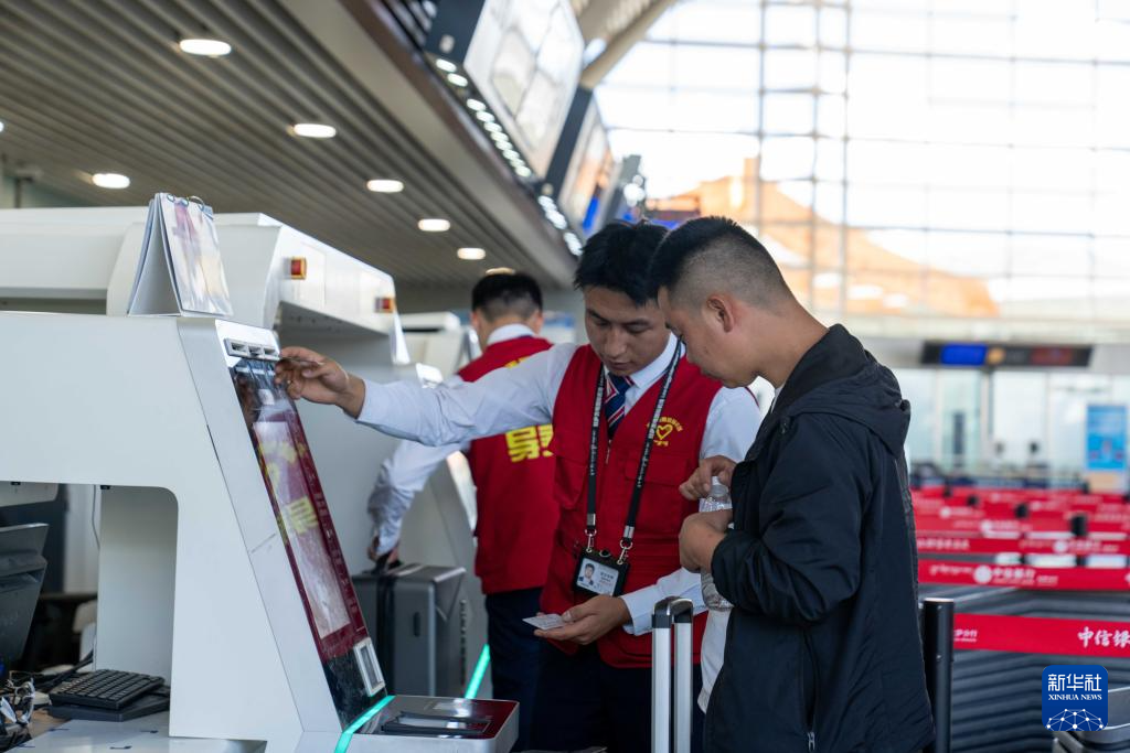7月18日,拉薩貢嘎國際機(jī)場工作人員在幫旅客辦理行李托運手續(xù)。新華社記者 旦增尼瑪曲珠 攝