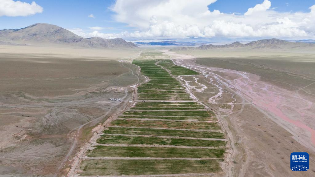 西藏阿里地區(qū)革吉縣文布當(dāng)桑鄉(xiāng)人工種草基地一景(7月20日攝,無人機照片)。新華社記者 旦增尼瑪曲珠 攝 ??