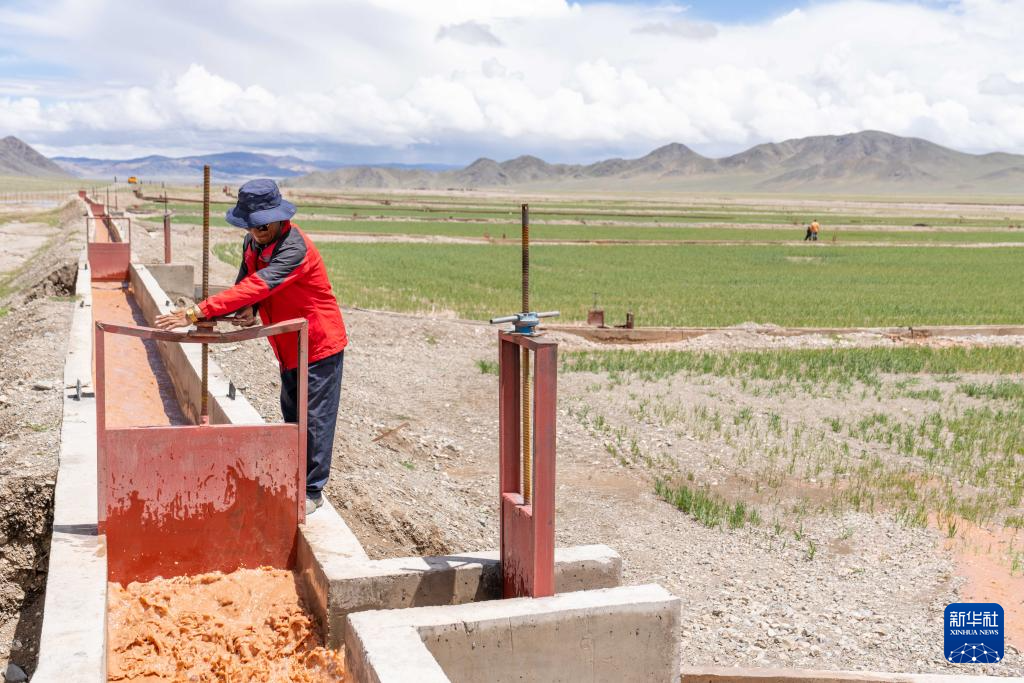 7月20日,西藏阿里地區(qū)革吉縣文布當(dāng)桑鄉(xiāng)夏瑪村村民嘎瑪旺堆在人工種草基地工作。新華社記者 旦增尼瑪曲珠 攝 ??