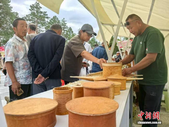 商戶在非遺大集銷售樺樹皮手工藝品。 姜輝 攝