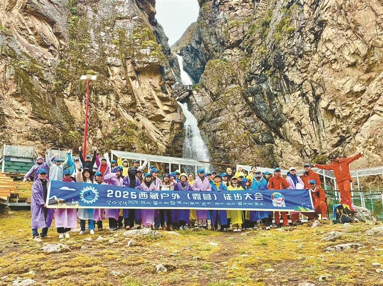 圖為參加西藏戶外(露營)徒步大會的戶外徒步愛好者在曲加瀑布前合影。記者 歐珠次仁 攝