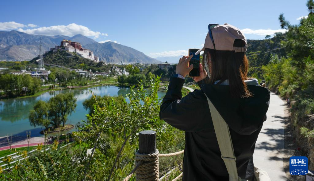 9月25日,在拉薩團(tuán)結(jié)公園旁的藥王山步行道上,一名游客拍攝美景。新華社記者 晉美多吉 攝 ??