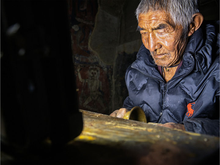 1987年,那時的東嘎石窟尚無人問津。甚至沒有像樣的路,阿旺米朗硬生生在陡峭的山體上走出了一條路。那會兒,石窟還有些滲水,他獨自一人扛著塑料布從山的另一邊繞上陡峭的山頂,在海拔4000多米的山頂為洞窟做防水措施;高原漫長的寒冬里,他能依靠的熱源只有手中的酥油燈——但沒過多久,他就發(fā)現(xiàn)酥油燈會熏黑墻壁,他便自己在石窟外搭了個簡單的房屋。