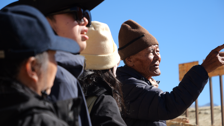這是守窟人之一的仁增旺扎老人在向游客介紹遺址情況。(2025年11月14日攝)新華社記者 莊云凱 攝