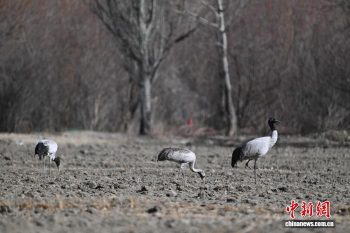 圖為山南市貢嘎縣境內(nèi),在田間覓食的黑頸鶴一家。中新社記者 貢嘎來(lái)松 攝