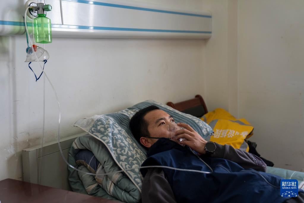 1月24日,扎加藏布信號(hào)工區(qū)職工陳占彪返回工區(qū)后在宿舍吸氧。新華社記者 旦增尼瑪曲珠 攝