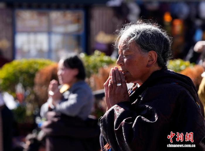 1月23日,西藏拉薩大昭寺外,信眾磕長(zhǎng)頭。冬季高原進(jìn)入農(nóng)閑期,眾多藏傳佛教信眾從各地來(lái)到拉薩,沿布達(dá)拉宮、大昭寺等地轉(zhuǎn)經(jīng)、朝拜、祈福。中新社記者 李林 攝