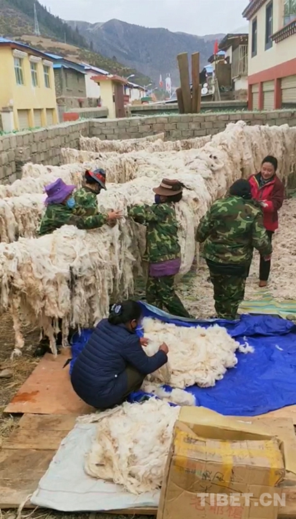 圖為扎西次措(右一)與學(xué)徒工人們晾曬羊毛 圖片由扎西次措提供