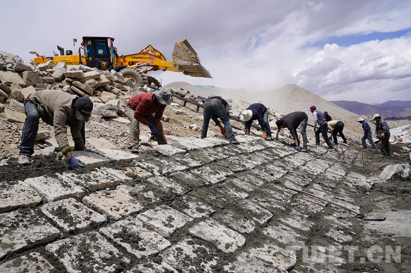 圖為農(nóng)民工施工聯(lián)隊長洛桑白珍(左二)與農(nóng)民工一起干活