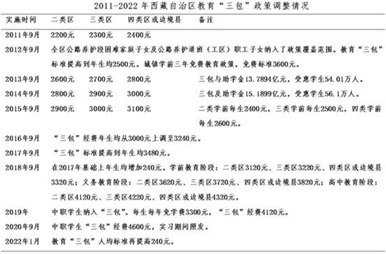 黨的十八大以來,“三包(包吃、包住、包學(xué)費(fèi))”人均標(biāo)準(zhǔn)不斷大幅提升。2012年起,西藏全面落實(shí)15年公費(fèi)教育“三包”政策。同年底,西藏“三包”年總經(jīng)費(fèi)由2008年的3.61億元增加到12.29億元,年均增幅達(dá)36%,受惠學(xué)生增加到51萬人。 到2014年,西藏“三包”經(jīng)費(fèi)增加到15.19億元,全區(qū)有52.5萬名學(xué)生受益,覆蓋面100%,實(shí)現(xiàn)了由“選擇性保障”到“覆蓋式保障”。 中央第六次西藏工作座談會(huì)后,投入力度更大。1985-2015年30年間,西藏“三包”經(jīng)費(fèi)累計(jì)投入逾80億元, 而到2020年35年投入超200億元。僅2016-2020年,西藏教育“三包”資金投入達(dá)104.74億元,年均增幅11.4%。 從1985年到2020年的35年間,西藏教育“三包”政策累計(jì)調(diào)整20次,2011-2020年的10年間,就調(diào)整了10次。2022年1月,“三包”人均標(biāo)準(zhǔn)再次提高。在比如縣,2021年底全縣享受“三包”及助學(xué)金的學(xué)生達(dá)到17771人, 占比如縣總?cè)丝诘?4.5%。