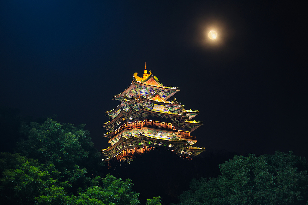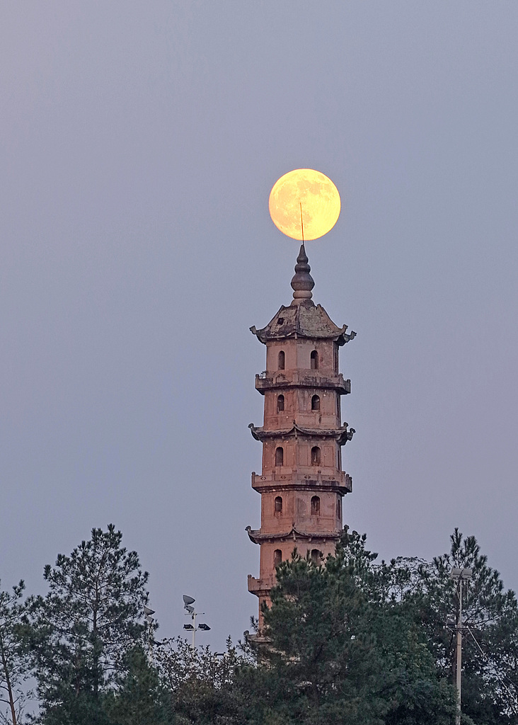 一輪圓月從浙江省臺州市仙居縣安洲塔上空升起。