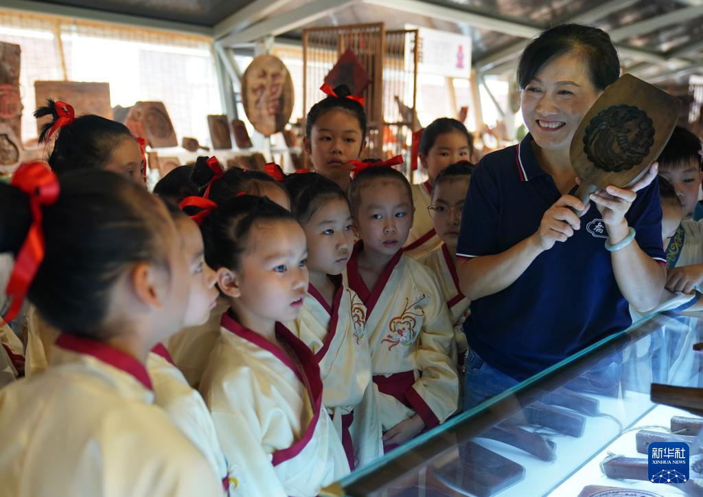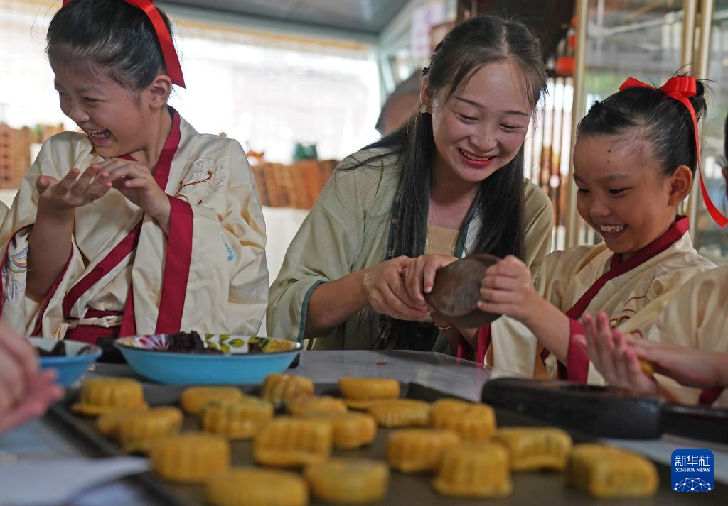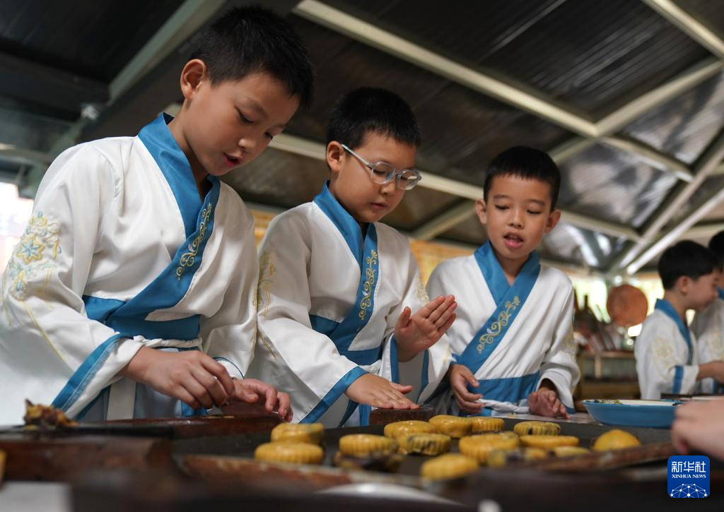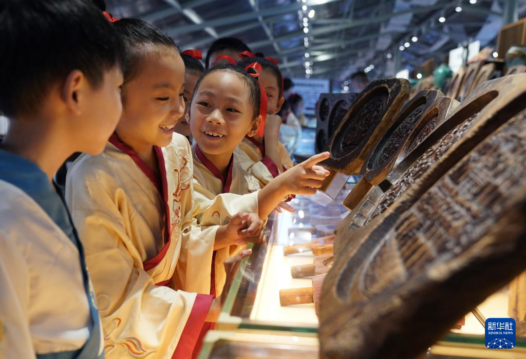 9月11日,孩子們?cè)趨⒂^傳統(tǒng)手工糕餅?zāi)>?。新華社記者 萬象 攝